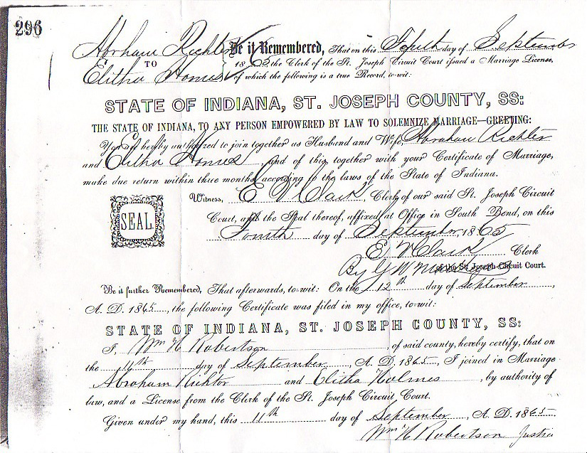 Abraham Richter was issued a marriage license to marry Elitha Homes on September 15th, 1865. This took place in St Joseph County, South Bend, Indiana….